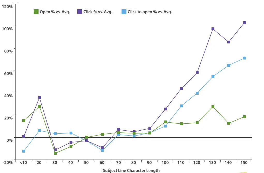 Voici ci-dessous, pour finir, un graphique proposé par Adestra qui résume ce que nous avons dit. La ligne verte correspond au taux d’ouverture. Selon l’étude qui sous-tend ce graphique, le nombre de caractères optimum pour un titre de mail court est égal à 20. On observe une chute du taux d’ouverture entre 20 et 30 caractères. Ensuite, le taux d’ouverture augmente globalement avec le nombre de caractères. On atteint même un pic à…130 caractères. La définition de ces pics ne doit pas être prise dans l’absolu. Les pics peuvent varier en fonction de votre cible, de votre activité, etc. L’idée à retenir est que, encore une fois, le titre doit être soit très court, soit très long. On observe d’ailleurs sur ce graphique que le titre du mail n’a pas seulement un impact sur le taux d’ouverture, mais en a un aussi sur le taux de clic (ligne violette). C’est ajouter un nouvel argument en faveur de l’importance capitale des titres d’email !