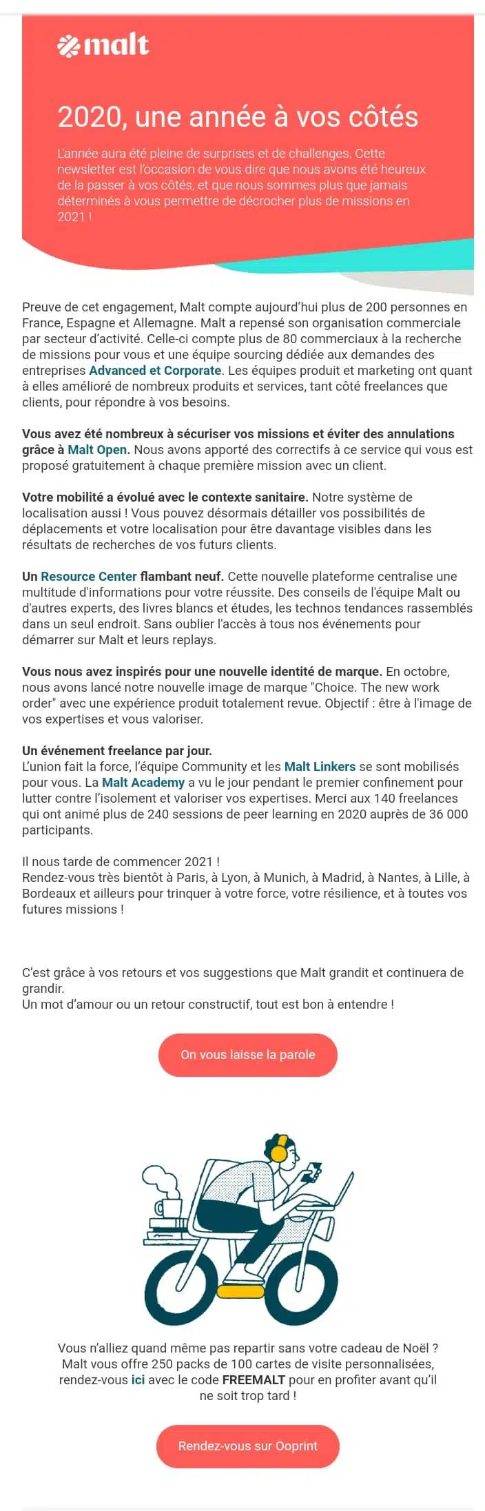 Dans son emailing, la plateforme de mise en contact de freelancer avec de potentiels clients souhaite assurer à ses membres qu’elle est prête à innover et à s’améliorer en permanence. On retrouve la charte graphique de Malt dès le premier coup d’œil (couleur orange, présence du logo en haut de la page…).