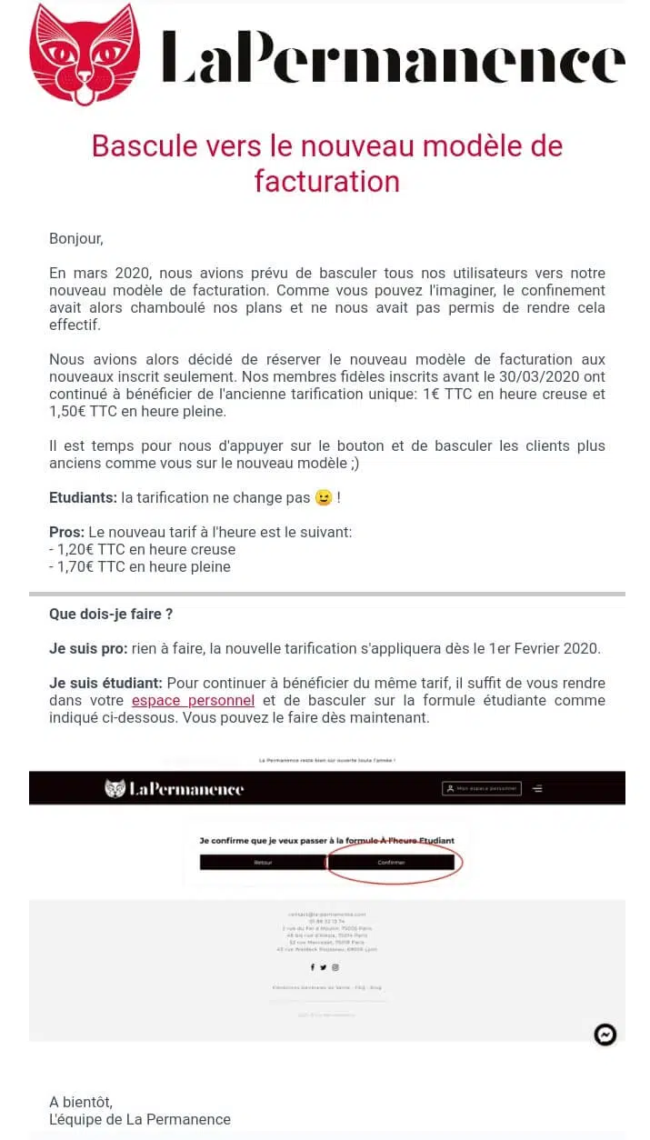 Dans le dernier de nos 7 exemples de campagnes emailing, les espaces de co-working de La Permanence ont choisit de diffuser une note d’information tous ses clients pour les informer ses clients de ses nouvelles conditions commerciales.