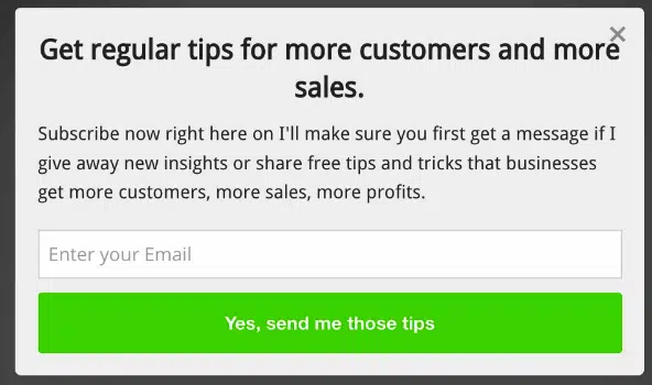 Etre clair ne suffit pas. Vous devez honorer votre promesse. Dans l’exemple ci-dessous, le visiteur donne son adresse pour recevoir des conseils, et pas pour souscrire un abonnement. Soyez transparent dans le wording de vos CTA. S’il s’agit de proposer à vos internautes de s’inscrire à la newsletter, écrivez « Inscrivez-vous » ou « Recevez notre newsletter ». Tous les popups qui convertissent bien ont des CTA clairs et explicites.