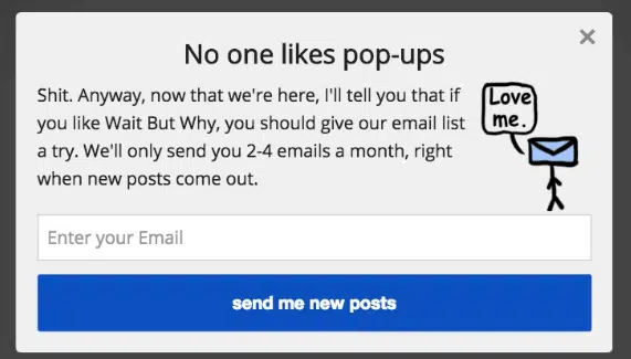 Les internautes voient de plus en plus de popups, des popups qui souvent se ressemblent les unes les autres. Ce qui produit de l’ennui et de l’indifférence. Pour capter l’attention de vos visiteurs, vous devez proposer des popups qui sortent de l’ordinaire – du point de vue de la mise en page éventuellement, mais surtout du contenu. Adoptez un ton original, mettez de la personnalité dans vos popups, utilisez l’humour, créez une proximité avec votre visiteur, accrochez l’internaute, créez la surprise. Bref : soyez inventif. Voici un exemple de popup original (proposé par Wait But Why), qui sort de l’ordinaire :