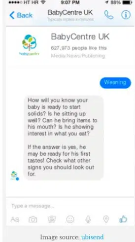 Le site web BabyCentre UK est une ressource fiable en matière de grossesse et de garde d’enfants au Royaume-Uni. Des calculatrices de date d’échéance aux articles sur les soins personnels pour les mères aux communautés d’utilisateurs, BabyCentre publie une quantité de contenu adaptée à toutes les étapes de la maternité. Et, son chatbot répond également. Avec son bot Facebook Messenger, BabyCentreUK pose des questions sur l’âge de l’enfant ou sur un problème auquel le parent est confronté, puis suggère des conseils personnalisés et un contenu ciblé afin d’expliquer les réponses du bot. Par exemple, lorsque le parent ci-dessous dit que son enfant est en cours de sevrage, BabyCentre propose des suggestions sur le moment où il est prêt à manger des aliments solides et les engage en leur demandant s’ils souhaitent connaître les autres signes à surveiller.