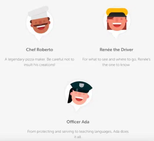 Pour faire correspondre différentes personnalités et styles d’apprentissage, Duolingo a également créé plusieurs robots de tutorat linguistique aux personnalités différentes :