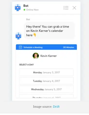 Si un visiteur s’engage, le bot est programmé pour répondre et déterminer si l’utilisateur est un prospect qualifié en fonction de ses questions et réponses. Les prospects qualifiés sont invités à prendre rendez-vous avec un représentant. Une intégration de calendrier facilite la réservation et une intégration CRM signifie que les prospects qualifiés sont automatiquement acheminés vers le vendeur approprié.