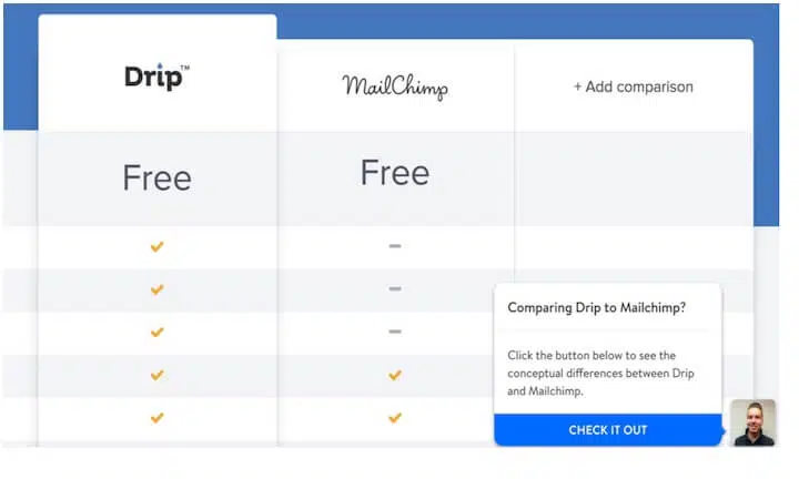 Dans cet exemple, LeadPages, un chef de file du secteur de la création de landing page par glisser-déposer, a commencé à utiliser la messagerie et les chatbots, notamment via des solutions comme Intercom ou HubSpot Chat, pour convertir les visiteurs du site d’un navigateur classique en une page de comparaison de produits. L’expérience a commencé petit, le bot apparaissant avec un message de bienvenue. Et ce changement mineur a fonctionné. Avant le message de bienvenue, LeadPages a eu 310 conversations en un mois. Le mois suivant, ils ont mis en œuvre le message de bienvenue et ont eu 1168 conversations avec les visiteurs du site. LeadPages a ensuite utilisé Drift pour configurer une campagne automatisée ciblant les utilisateurs en fonction de la page actuellement visitée. Les messages automatisés dirigeaient les visiteurs, en fonction de leurs besoins, vers une page de comparaison de produits, souvent la dernière étape avant l’achat.