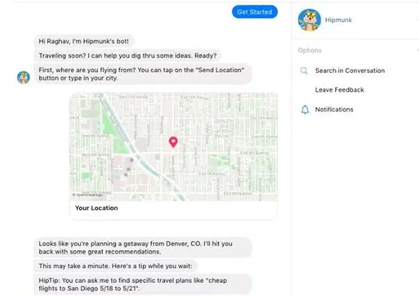 Le bot utilise l’emplacement du visiteur pour déterminer son lieu de destination, puis lui envoie des offres exceptionnelles à partir de cet emplacement. Ce chatbot simple, mais pratique, facilite la recherche d’informations sur plusieurs sites et le rend plus pratique en le plaçant directement dans l’application Messenger. Imaginez à quel point il est plus facile de planifier un voyage avec vos amis lorsque vous discutez avec eux dans une fenêtre et que vous recherchez des vols dans une autre. De plus, le bot d’Hipmunk pour Facebook Messenger utilise un langage conversationnel amical pour créer une expérience informelle personnalisée qui imite la manière dont vous pourriez parler à un agent de voyage ou même à un ami. Les internautes ont l’habitude de discuter en ligne avec leurs amis, que ce soit sur Slack, WhatsApp, Discord ou d’autres canaux. Le chat est désormais associé aux langages occasionnels, aux emojis et aux GIF. (Il suffit de regarder comment Slack transcende la boîte de réception traditionnelle avec des émojis amusants, des réactions et des gifs faciles à créer). Le chatbot de Hipmunk partage également des cartes, permettant aux utilisateurs de s’assurer que le bot a bien déterminé le bon emplacement, tandis que les «HipTips» utilisent le temps d’attente pour proposer de nouvelles offres et montrer aux utilisateurs de nouvelles manières optimisées d’utiliser l’application. Dans l’ensemble, c’est un excellent exemple de bot à la fois cool et efficace. Selon le PDG de Hipmunk, l’utilisateur moyen effectue environ 20 recherches lorsqu’il planifie un voyage. En condensant le processus de recherche en une seule conversation et en s’adressant de manière proactive aux visiteurs du site, le chatbot contourne facilement les sites de voyages qui incombent à l’utilisateur de rechercher lui-même les offres.