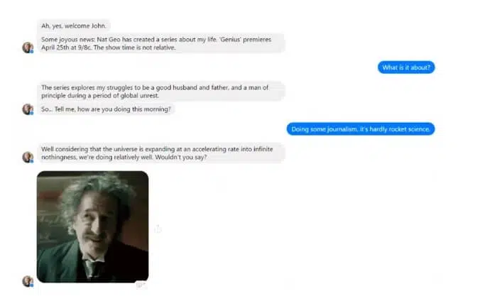 Pour promouvoir la nouvelle émission télévisée Genius de National Geographic, qui relate la vie de personnalités comme Albert Einstein et Pablo Picasso, la page Facebook de l’émission présentait un bot Messenger qui conversait avec les utilisateurs à partir de la voix de Genius. Par exemple, avant l’émission diffusée sur Albert Einstein, les visiteurs de la page ayant cliqué sur «Envoyer un message» étaient en relation avec «Einstein». Ce bot a suivi la conversation de l’utilisateur, lui donnant des informations sur le spectacle et des plaisanteries sur la relativité et d’autres sujets étudiés par Einstein.
