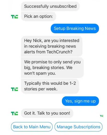 TechCrunch utilise des chatbots, accessibles via des applications de messagerie modernes ou directement sur leur site, pour vous envoyer le contenu que vous voulez, quand vous le souhaitez. Le chatbot vous permet de choisir le nombre de fois où vous souhaitez recevoir un nouveau contenu, ainsi que le type de contenu (histoires chaudes, auteurs spécifiques, etc.).