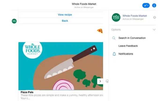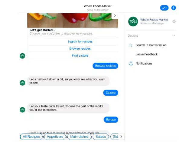 Présentant des filtres et des options pour différents types d’aliments, y compris des cuisines internationales, avec chaque message, Whole Foods permet aux utilisateurs de préciser le type de recette qu’ils recherchent. Une fois que suffisamment de filtres ont été sélectionnés, le bot présente un lien vers une recette spécifique qui dirige les utilisateurs vers le site web de la société. Plutôt que de compter sur les visiteurs directs, le chatbot de Whole Foods génère du trafic vers leur site depuis des plateformes de messagerie où les utilisateurs passent une part croissante de leur temps en ligne. De plus, avec 60 millions d’emojis utilisés sur Facebook par jour, le robot de Whole Foods reproduit une conversation classique (entre humains) en permettant aux utilisateurs de se frayer un chemin vers des recettes spécifiques en utilisant des emojis. Par exemple, si un emoji de pizza est envoyé, le bot renvoie une recette de pizza. Amusant, non ?