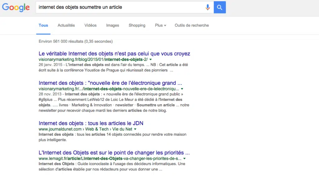 Sur un plan opérationnel, nous vous conseillons de commencer par cibler les sites en lien avec votre activité qui sont en mesure de publier des articles invités. Si vous trouvez un site proche de votre thématique qui a déjà publié des articles invités, foncez et entrez en contact avec le webmaster pour lui faire une proposition. Pour trouver ce genre de sites, vous pouvez utiliser Google et taper des expressions du type : « Article invité », « Ecrivez pour nous », « Soumettre un article », « Article écrit par », « Devenez contributeur ». Ajouter à ces expressions un mot-clé correspondant à votre thématique. Exemple : « soumettre un article internet des objets » :