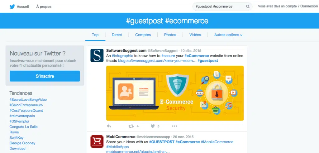 N’hésitez pas à utiliser le symbole étoile (*) pour avoir plus de résultats dans Google. Si par exemple, vous recherchez « Soumettre * article », Google vous proposera les résultats pour : « Soumettre un article », « Soumettre votre article », « Soumettre un nouvel article », etc. Vous pouvez aussi identifier des opportunités de guest-blogging en utilisant Twitter. Tapez dans la barre de recherche « #guestpost » + « #thématique » :