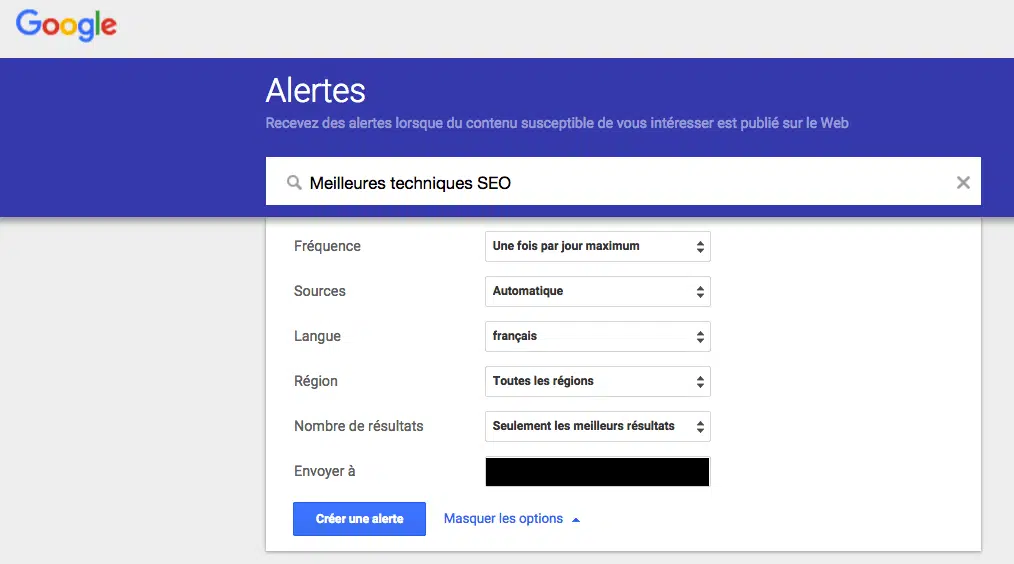 Sur Google Alterts, vous pouvez configurer la fréquence des alertes, la source des contenus, la langue utilisée et d’autres critères encore :