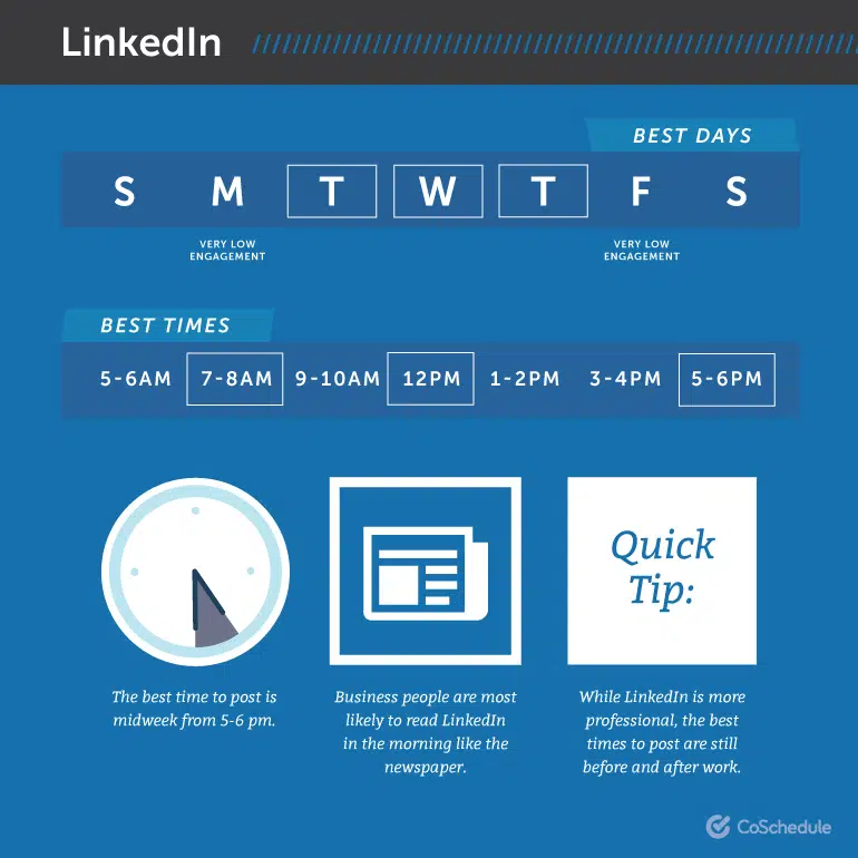Selon CoSchedule, voici les jours et heures à prendre en compte lors de vos publications sur LinkedIn :