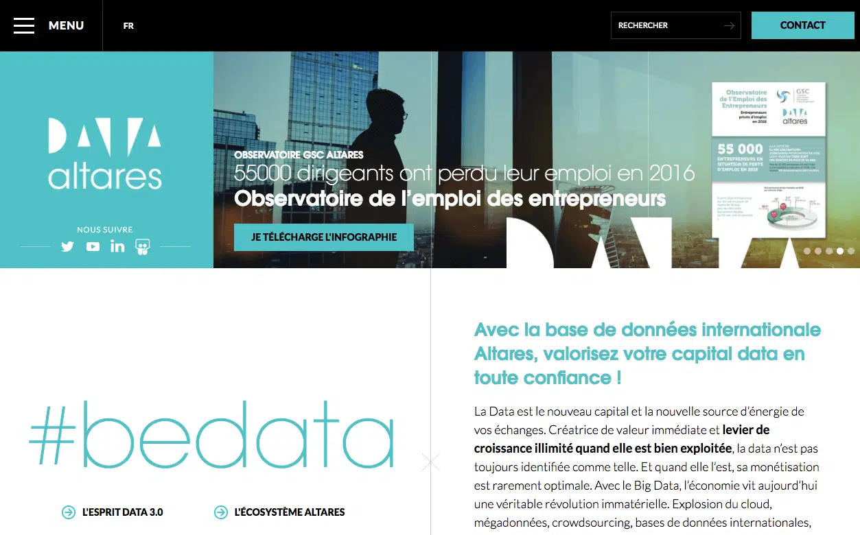 Créé en 2006, Altares est un acteur de référence au niveau mondial dans le domaine de la data B2B. Il met à disposition des informations (financières, légales, marketing…) sur des entreprises du monde entier (dont 18 millions d’entreprises en France). Entre autres prestations, Altares propose des services de prospection B2B pour identifier des clients, des fournisseurs, des partenaires potentiels ou des dirigeants, via sa filiale Manageo.