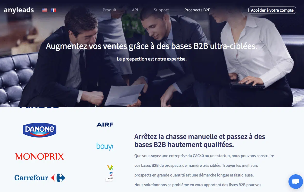 Anyleads propose des fichiers de prospection « ultra-ciblés » composés uniquement d’emails vérifiés (selon l’éditeur). La plateforme s’appuie sur des outils d’automatisation et d’intelligence artificielle pour affiner le ciblage selon vos critères (zone géographique, activité, fonctions, etc.), et fournit les fichiers sous des formats compatibles avec les principaux CRM et solutions d’emailing. Anyleads se positionne clairement dans la prospection haut-de-gamme, respectueuse des bonnes pratiques et qualitative. L’éditeur garantit un taux de délivrabilité de 95%.