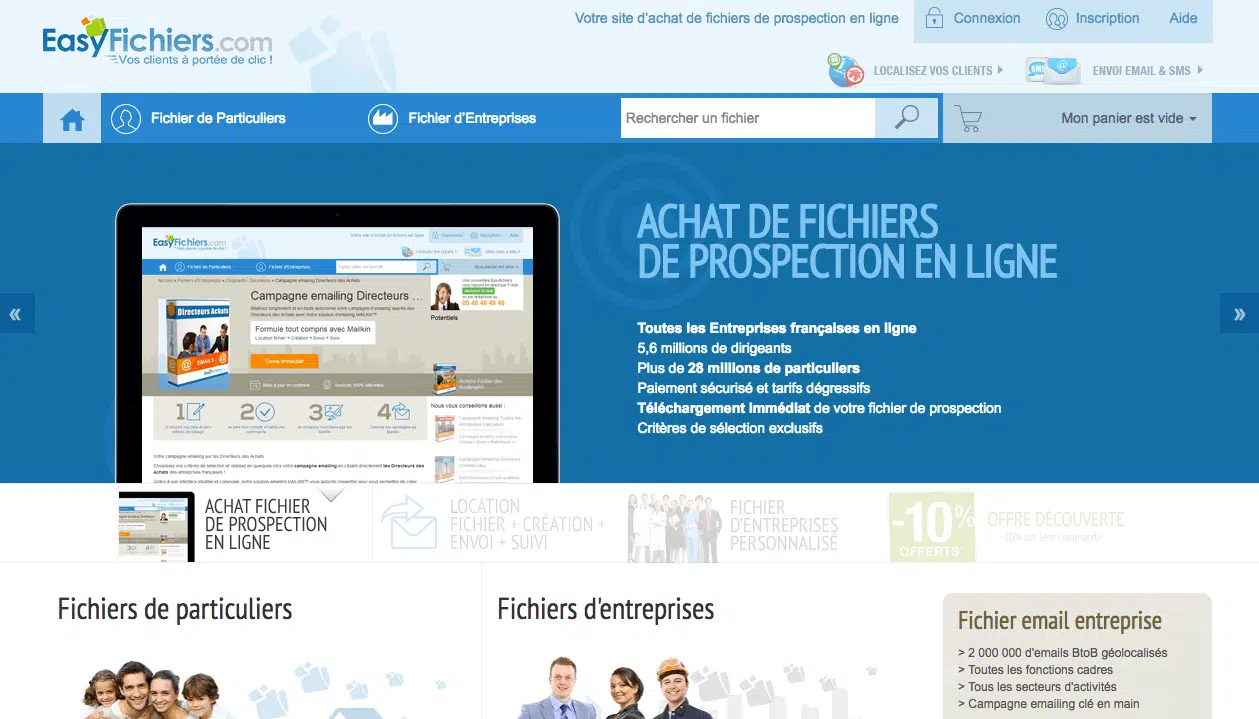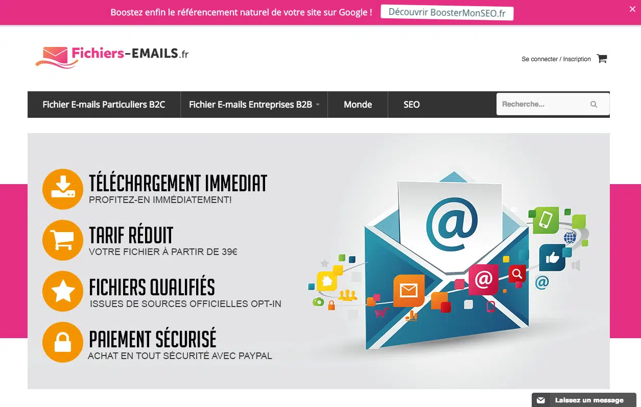 Vous l’aurez compris par son nom, Fichiers-Emails ne vend pas des couches pour bébé. La plateforme propose de l’achat de fichiers emails B2B ou B2C (opt-in). Pas de sur-mesure ici, la plateforme commerciale des fichiers d’emails packagés. Les fichiers vendus ne sont pas du tout ciblés.