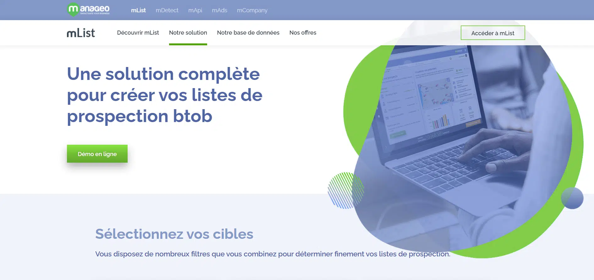 Manageo est une plateforme d’activation de contacts B2B. Via sa solution mList, Manageo s’adresse aux TPE, PME et Grands Comptes pour fournir un outil de création de fichiers de prospection ciblés. mList propose des fonctionnalités personnalisées et des outils de customisation pour s’adapter aux besoins spécifiques des entreprises. mList possède une base de données mise à jour quotidiennement contenant plus de 10,2 millions de sociétés scorées et analysées. Depuis 2021, la solution a d’ailleurs connu quelques évolutions comme la création d’une nouvelle application vous permettant de créer une liste étape par étape ou encore l’ajout de nouvelles fonctionnalités dès les premiers niveaux d’abonnement comme l’utilisation d’outils de dessin sur carte pour faciliter ses ciblages.
