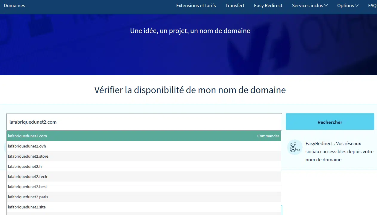 Voici un exemple de vérification de disponibilité de nom de domaine sur OVH :