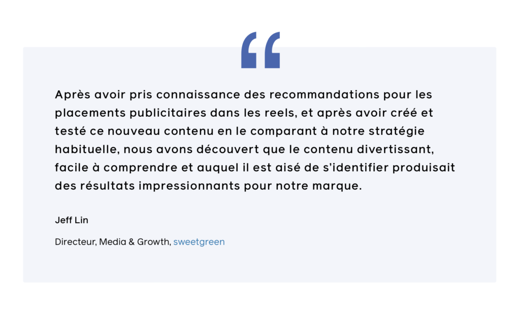Pour séduire une nouvelle clientèle et stimuler les commandes en ligne, Sweetgreen a misé sur les publicités réels. Résultat ? Une augmentation des ventes incrémentales par sept, un coût par conversion réduit de 95 %, et une baisse de 14 % du coût par achat. Avec des vidéos immersives et engageantes – comme des suggestions de salades selon les signes astrologiques ou des publicités décalées – la marque a parfaitement exploité le potentiel des reels pour captiver son audience et booster ses performances. Un exemple concret de créativité stratégique qui paie.