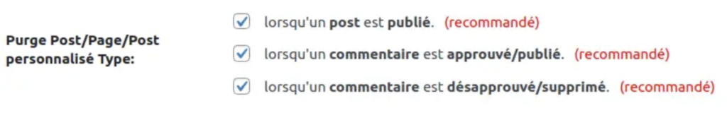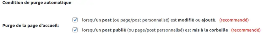 Le conseil ici : cochez ces deux options. Pourquoi ? Parce que si vous modifiez, ajoutez ou supprimez une page ou un article, cela peut changer des éléments visibles sur la page d’accueil (par exemple, un menu ou un widget avec les derniers articles). Il est donc crucial que le cache se purge automatiquement pour refléter ces modifications.