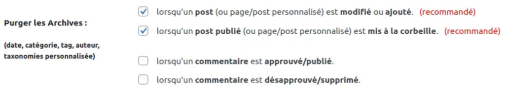 Les archives de votre site peuvent également bénéficier de la purge du cache, mais seules certaines actions nécessitent cela. Vous aurez quatre options ici :
