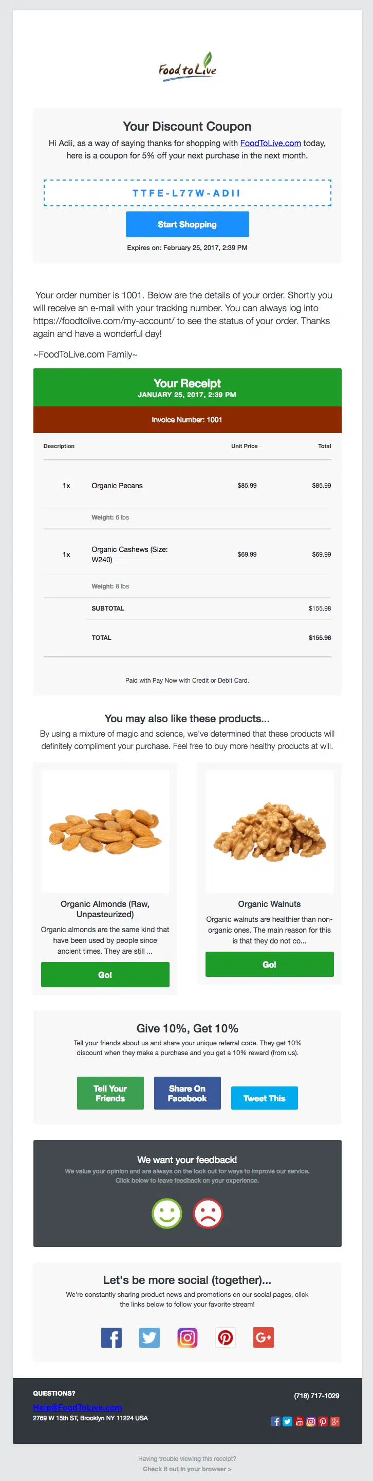 - Intégrez des éléments marketing dans vos emails de confirmation ou de reçu afin d’encourager au ré-achat.