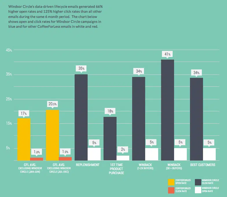 L’emailing ne coûte pas cher. Raison de plus pour améliorer votre relation client via les emails post-achat. Dans une étude de cas très instructive, Windsor Circle (un ancien logiciel de rétention marketing, aujourd’hui remplacé par des solutions plus modernes comme Klaviyo ou Customer.io) a montré l’impact qu’avait eu les emails post-achat sur les revenus de l’un de ses clients. CoffeeForLess a généré $500 000 de ventes supplémentaires en 6 mois grâce à sa stratégie d’emails post-achat (pour un CA de $19M). Les emails en question ont présenté des taux d’ouverture supérieurs de 66% comparé aux autres emails (et des taux de clics supérieurs de 125%).