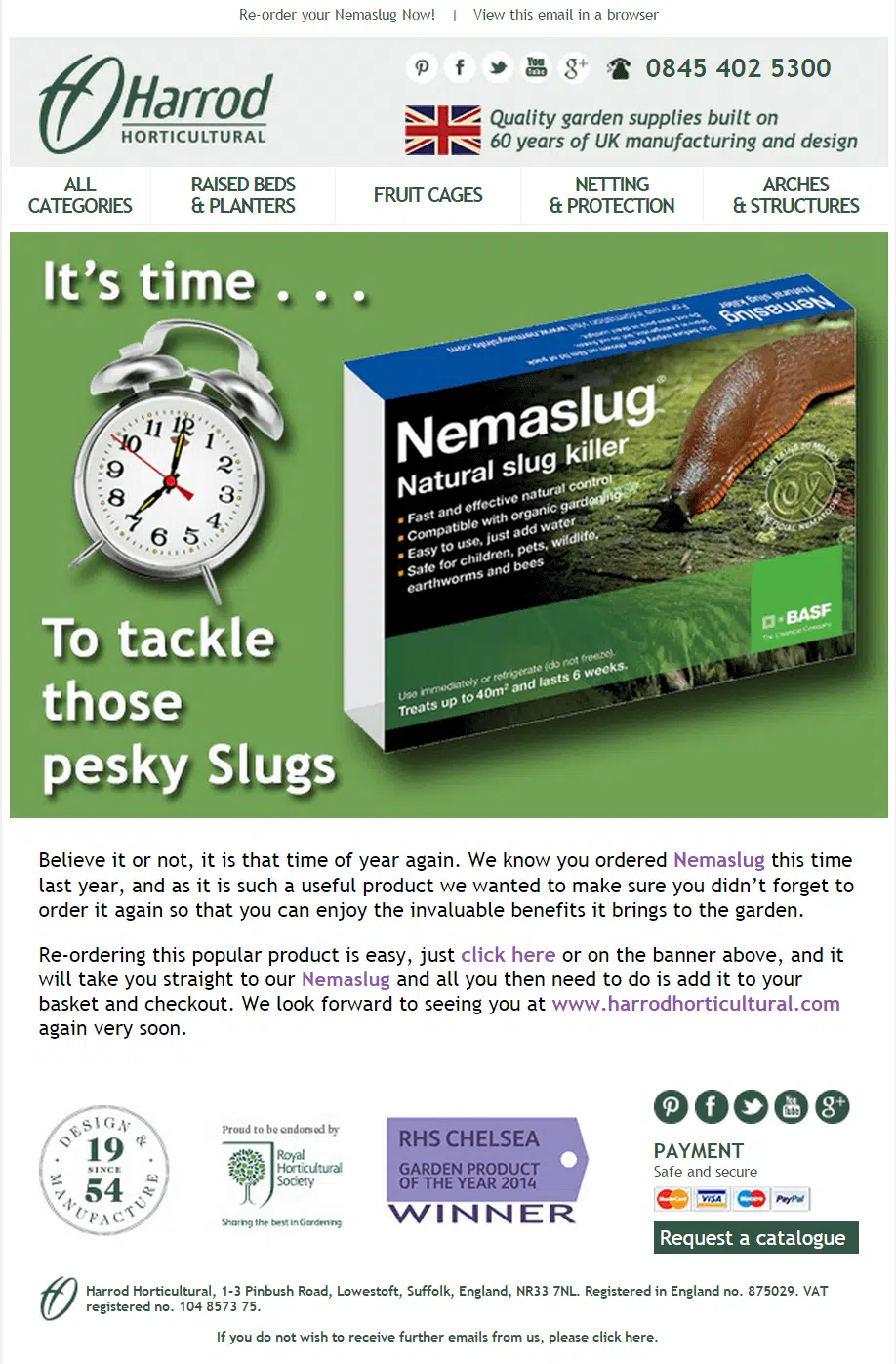 La plupart des produits ont un cycle de vie prévisible. Lorsqu’on connaît ce cycle, il peut être intéressant d’envoyer un email de ré-achat quelques jours avant la fin du cycle. Dans ce type d’email post-achat, l’objectif est d’inciter le client a ré-acheter le produit. Cette technique permet de générer des revenus récurrents. Voici un exemple (Harrod Horticultural) :