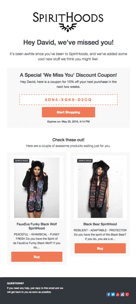 Les recommandations constituent une alternative aux emails promotionnels. Elles permettent de développer les ventes et la durée de vie des clients sans avoir besoin d’utiliser de codes promo. Comme le souligne Lead Novation, pensez à toujours à justifier les recommandations (« suite à votre achat de X, nous avons pensé que ces produits pourraient également vous intéresser », etc.)