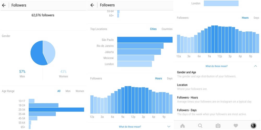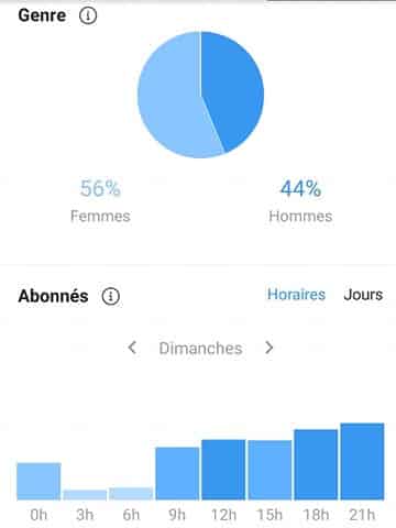 Il s’agit de statistiques démographiques de tous vos abonnés par sexe, lieu, âge et horaire de connexion. Bien sûr, ce dernier point est particulièrement utile pour déterminer quand, exactement, est le meilleur moment pour publier votre contenu sur Instagram.