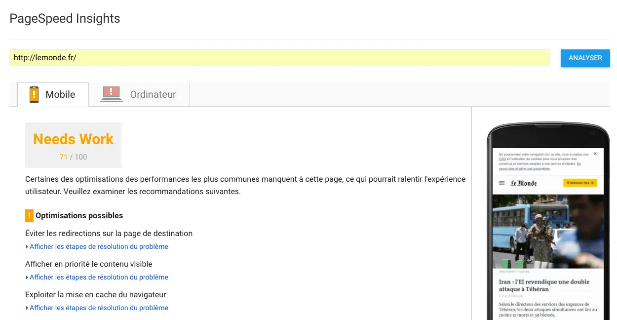 Est-ce que vos pages web sont responsive ? Est-ce qu’elles s’adaptent aux tailles d’écran qui sont celles des appareils mobile ? Vos pages ont-elles une version spécifique pour mobile ? Pour répondre à toutes ces questions, vous pouvez utiliser les outils suivants :