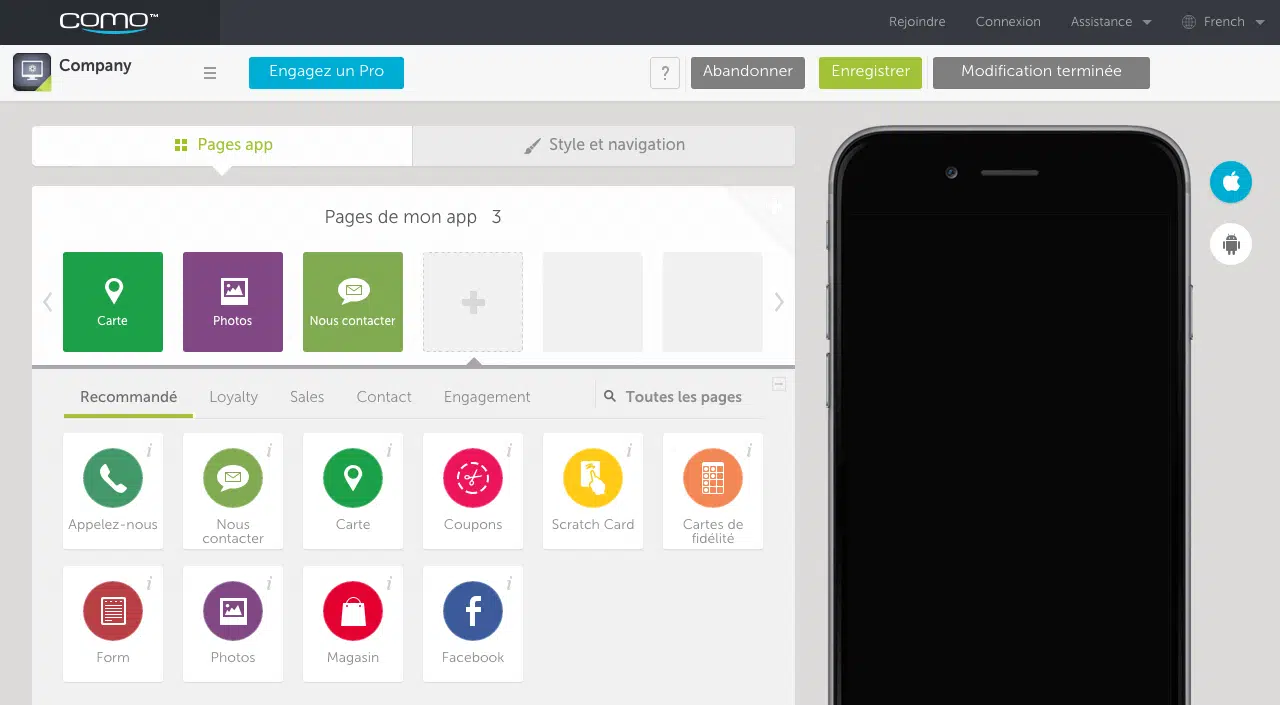 Ajouter des pages : Selon la portée de chacune des pages de l’application en création, l’outil de création en ligne permet de modéliser directement la page : En un clic, on peut ajouter une carte, un formulaire de contact, des liens vers les médias sociaux, des contenus photos et vidéos, etc.
