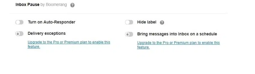 Boomerang a récemment publié une nouvelle fonctionnalité appelée Inbox Pause. Inbox Pause déplace tous les messages entrants dans un dossier distinct. Vous pouvez même cacher ce dossier si vous êtes inquiet de voir un courrier non lu. Lorsque vous activez Inbox Pause, une fenêtre contextuelle offre plusieurs options. Ceux-ci comprennent un répondeur automatique, la capacité mentionnée ci-dessus de cacher l’email et l’option de réinitialiser automatiquement à un certain moment.