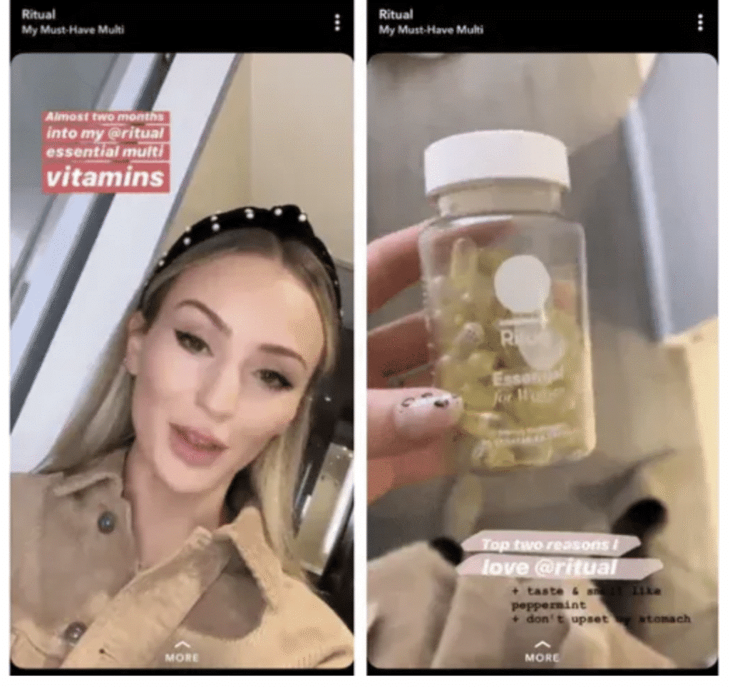 La marque a lancé un hashtag, les utilisateurs ont pris le relais. Résultat : des vidéos brutes, sincères, partagées en masse sur Snapchat… que Ritual a amplifiées dans ses ads. Le message passe mieux quand il vient du miroir de la salle de bain.