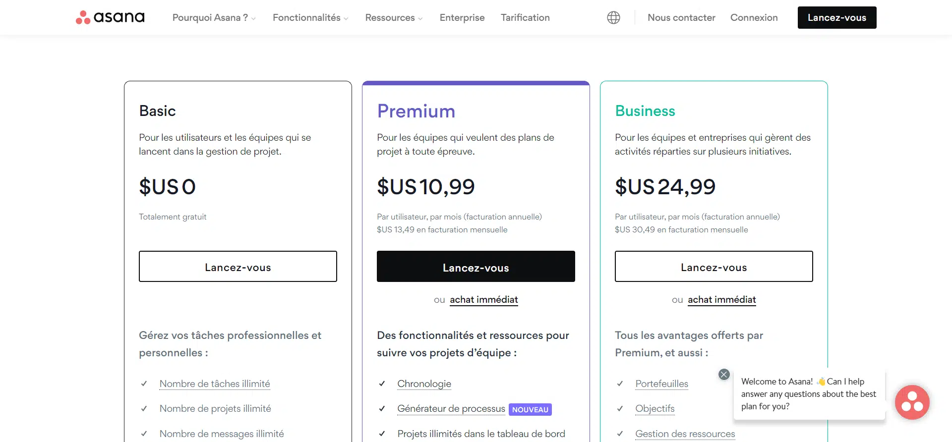 Cependant, lorsque vous souhaitez utiliser les fonctionnalités avancées d’Asana telles que les jalons, le suivi de la charge de travail et les portefeuilles, vous devrez passer à une version payante. La structure tarifaire d’Asana est basée sur un modèle par utilisateur et par mois, bien que cela ne soit pas nécessairement le plus compétitif. Asana propose trois plans :
