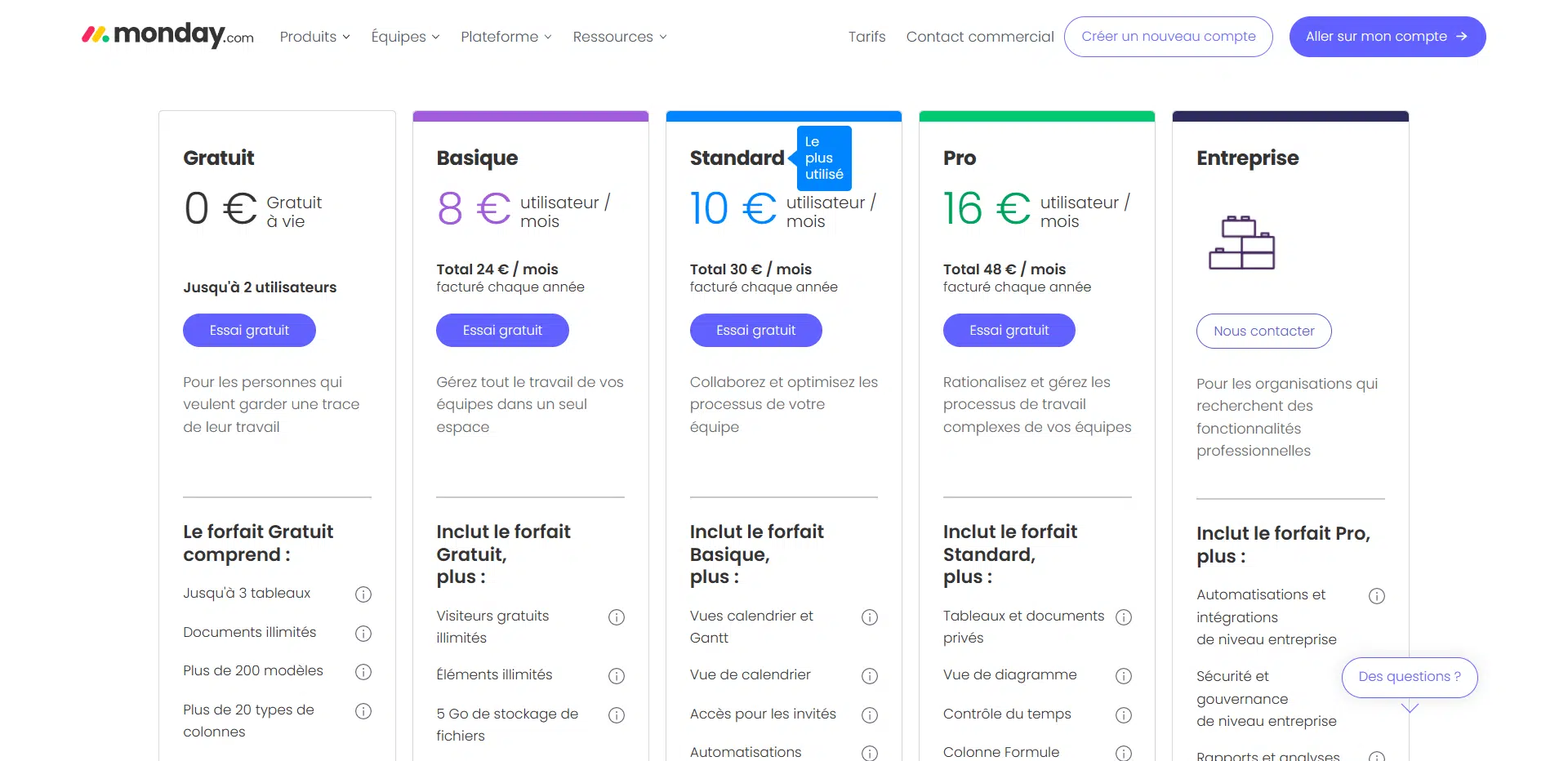 Les tarifs des plans intermédiaires d’Asana et de Monday sont similaires, aucun n’offrant d’avantage évident. Cependant, il convient de noter que tandis qu’Asana se démarque avec son plan gratuit fonctionnel, monday.com propose le plan avancé le plus abordable.