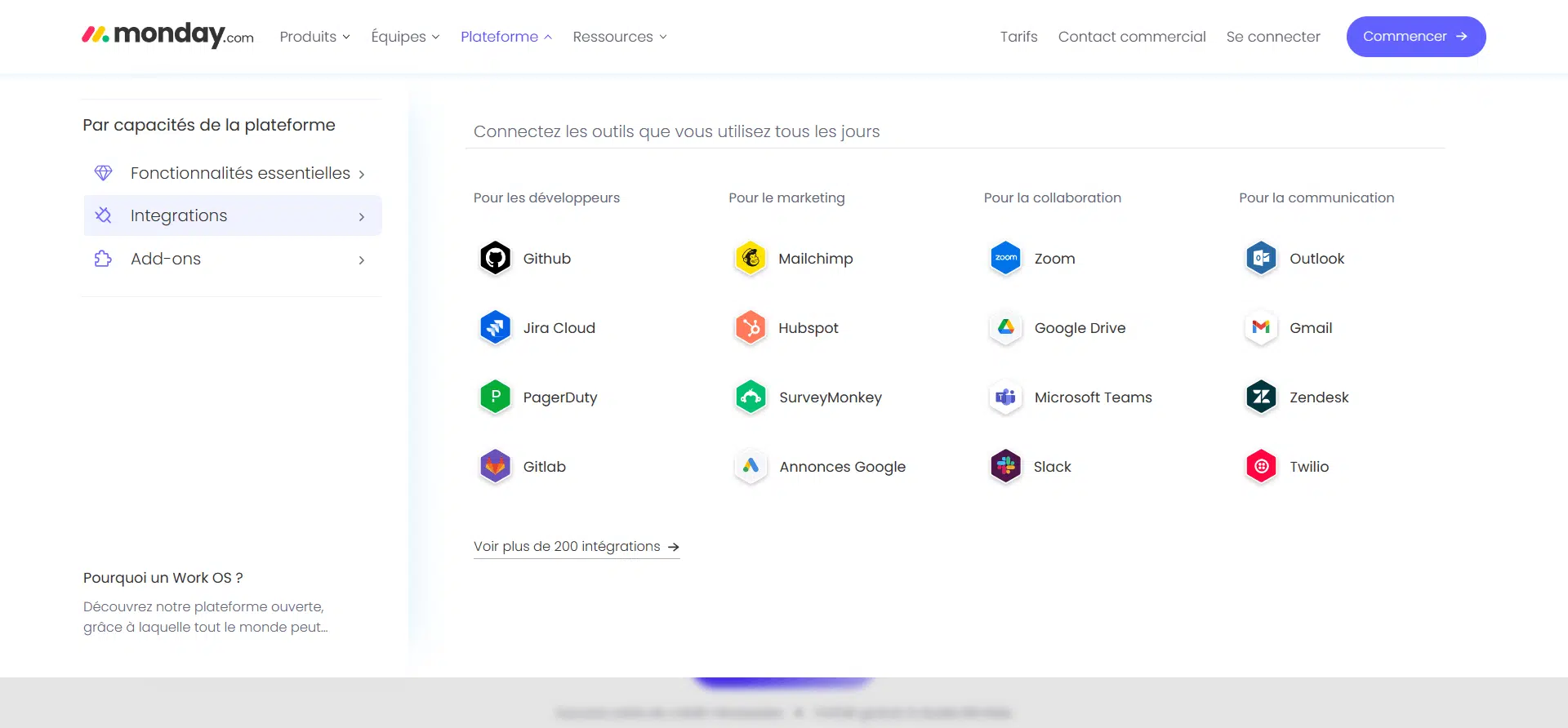 Monday.com propose désormais un catalogue d’intégrations nettement élargi, couvrant la plupart des outils SaaS majeurs du marché (messageries, CRM, outils de stockage cloud, plateformes collaboratives, etc.). L’intégration avec des plateformes comme Microsoft Teams, Zoom, Google Workspace, Slack, Salesforce ou encore HubSpot est devenue standard. Monday.com facilite également la création d’intégrations personnalisées via son API et des connecteurs no-code, répondant ainsi aux besoins d’interopérabilité des équipes modernes.