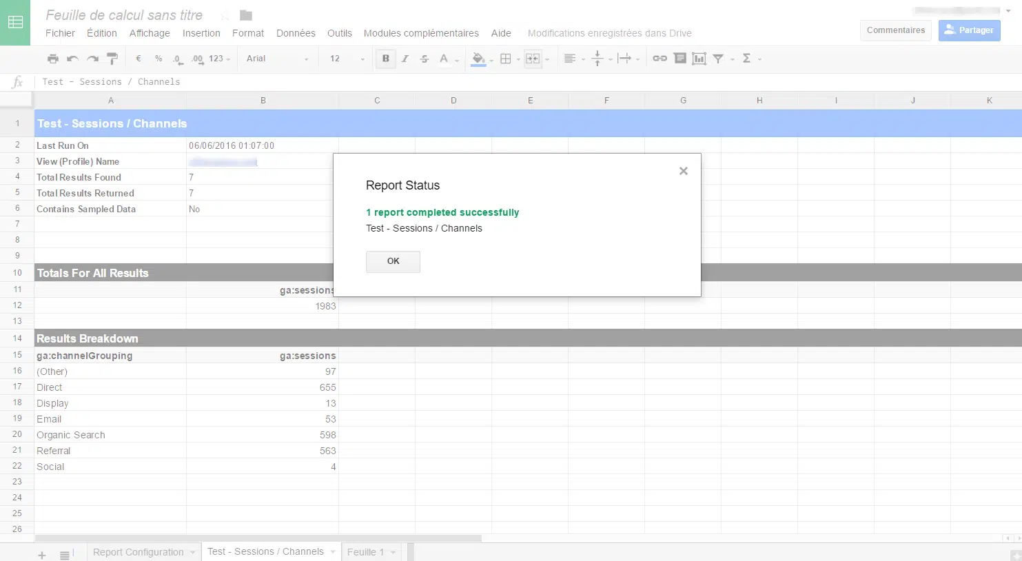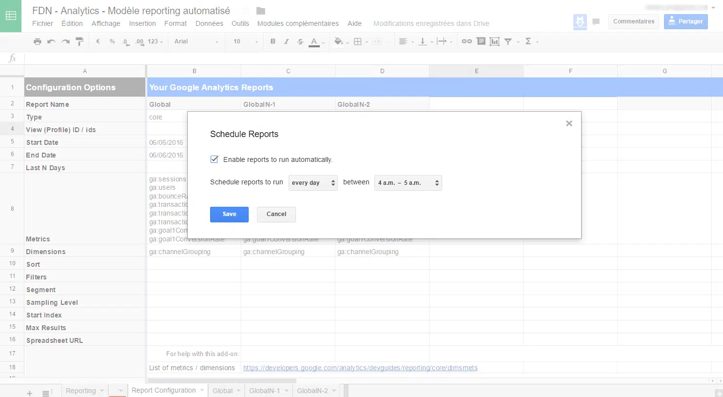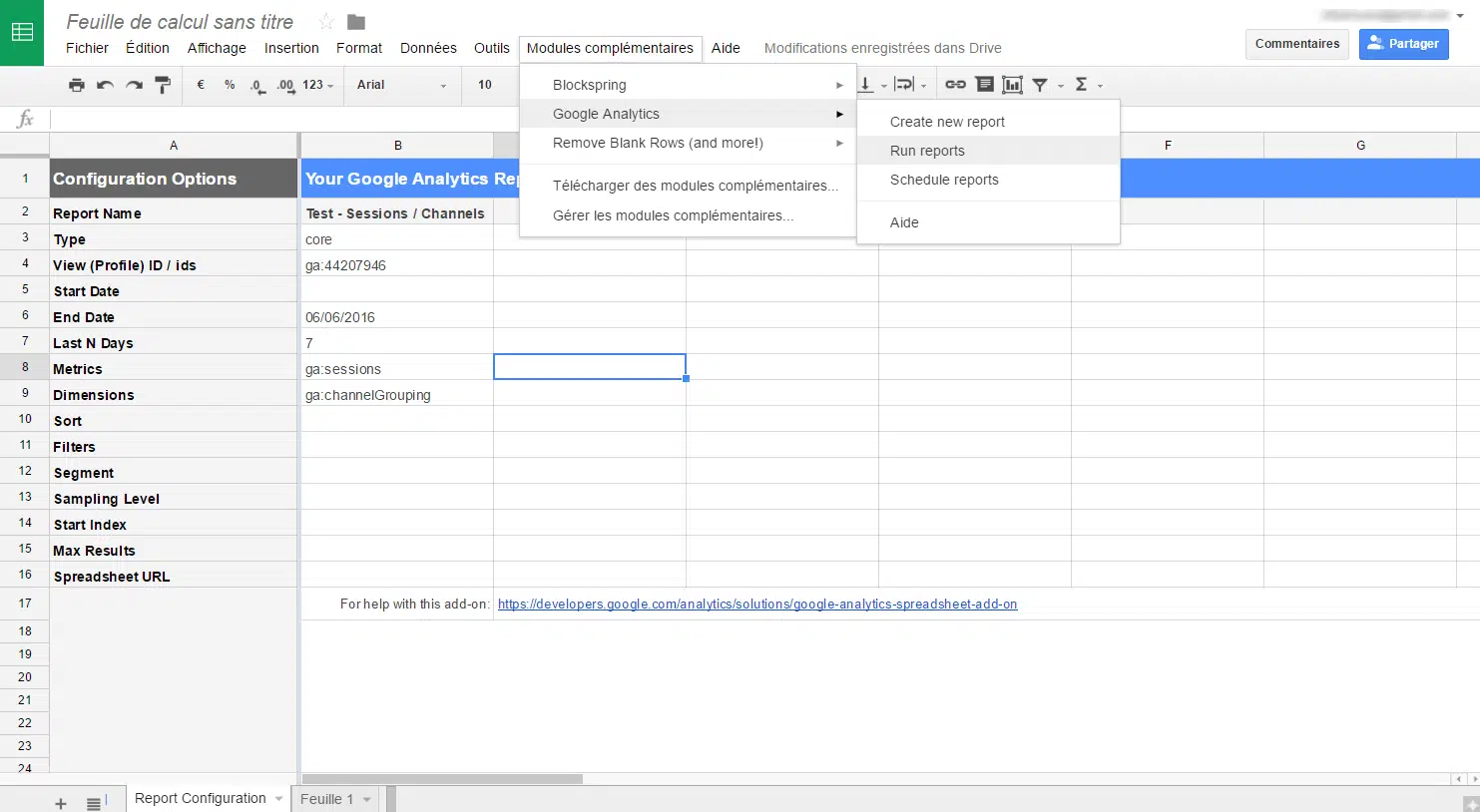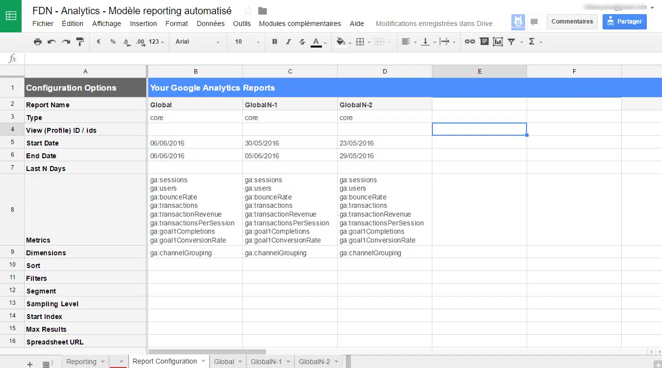 Pour chaque colonne créé dans l’onglet « Report configuration », un nouvel onglet est généré avec les résultats. Par conséquent, nous vous conseillons de créer un onglet « Reporting global » qui va consolider les résultats en allant chercher les données dans chaque onglet généré par le plugin. Si vous ne modifiez pas l’ordre des metrics / dimensions, mais que vous ne faites qu’en rajouter, les positions des données ne changeront pas. Et pour les plus rigoureux, il est toujours possible de faire de l’INDEX(EQUIV()) avec le nom des metrics / dimensions.