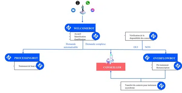 - En cas de demande complexe, l’intervention d’un conseiller est nécessaire. S’il est disponible, le callbot transfère les informations du client au conseiller qui prend en charge l’appel. S’il est indisponible, un voicebot de débordement (overflow) prend sa place pendant l’attente. Il procède à un pré-traitement et à une retranscription de la demande.