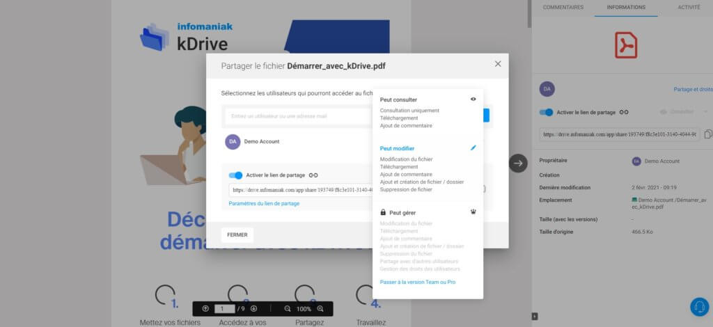 A noter également, la fonctionnalité « boîte de dépôt ». Vous avez la possibilité d’inviter vos clients, partenaires etc. à vous envoyer des fichiers externes dans votre kDrive en toute sécurité, même sans avoir de compte Infomaniak. Une collaboration totale.