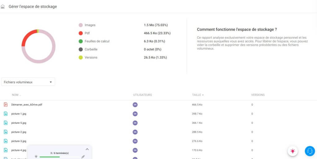 À l’intérieur de votre tableau de bord kDrive, vous pourrez voir toutes les données liées à votre espace de stockage. Vous verrez en un clin d’œil quel utilisateur consomme le plus d’espace de stockage, quels fichiers prennent le plus de place etc. kDrive peut stocker jusqu’à 106 To de données ce qui vous donne une grande marge de manœuvre.