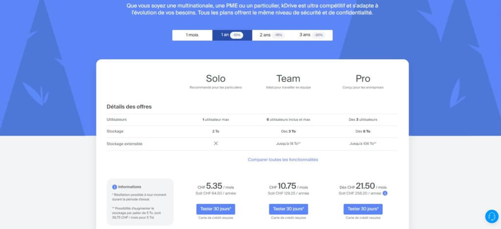 - Si vous souhaitez monter en gamme, optez pour le forfait Team à 129.25 CHF/an (118€ environ). 6 utilisateurs pourront utiliser l’outil et votre stockage de 3 To pourra être extensible jusqu’à 18 To. En plus du forfait Solo, vous pourrez récupérer facilement les données d’un utilisateur supprimé ou encore vérifier les utilisateurs qui se connectent sur kDrive.