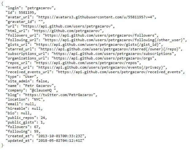 En termes techniques, la différence est le format de la demande et de la réponse. Pour rendre toute la page web, votre navigateur attend une réponse en HTML, qui contient du code de présentation, tandis que l’appel de l’API de Google Calendar retournerait simplement les données – probablement dans un format comme JSON. Si le serveur de votre site web effectue la demande d’API, le serveur de votre site web est le client (similaire à votre navigateur étant le client lorsque vous l’utilisez pour accéder à un site web). Du point de vue de vos utilisateurs, les API leur permettent d’effectuer l’action sans quitter votre site. La plupart des sites web modernes utilisent au moins certaines API tierces. De nombreux problèmes ont déjà une solution tierce, que ce soit sous la forme d’une bibliothèque ou d’un service. Il est souvent plus simple et plus fiable d’utiliser une solution existante. Il n’est pas rare que les équipes de développement divisent leur application en plusieurs serveurs qui se parlent entre eux via des API. Les serveurs qui exécutent des fonctions d’assistance pour le serveur d’application principal sont communément appelés microservices. En résumé, lorsqu’une société propose une API à ses clients, cela signifie simplement qu’elle a créé un ensemble d’URL dédiées qui renvoient des réponses de données pures, ce qui signifie que les réponses ne contiendront pas le type de présentation que vous attendez dans un interface utilisateur graphique comme un site web. Pouvez-vous faire ces demandes avec votre navigateur ? La plupart du temps, oui. Étant donné que la transmission HTTP réelle se produit dans le texte, votre navigateur fera toujours de son mieux pour afficher la réponse. Par exemple, vous pouvez accéder directement à l’API de GitHub avec votre navigateur sans avoir besoin d’un accès. Voici la réponse JSON que vous obtenez lorsque vous visitez l’API d’un utilisateur GitHub dans votre navigateur (https://api.github.com/users/petrgazarov) :