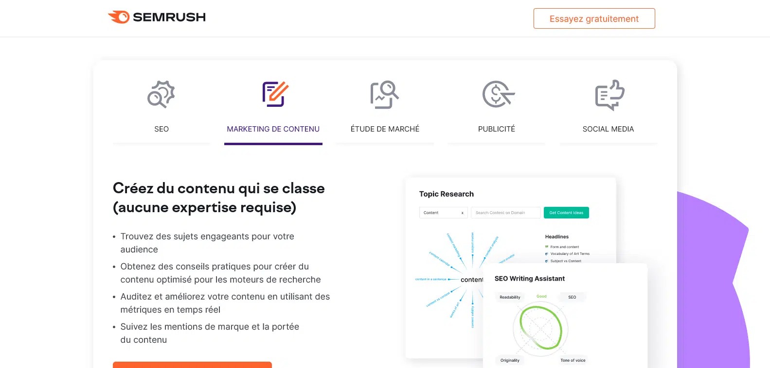Les outils Marketing et SEO comme SEMrush permettent aussi de consulter les mots-clés fréquemment utilisés et les sujets engageants pour votre audience, afin d’identifier facilement une problématique à laquelle vous pourriez répondre avec votre ebook.