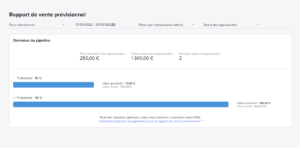 - Opportunités avec valeur, probabilité, prochaine action