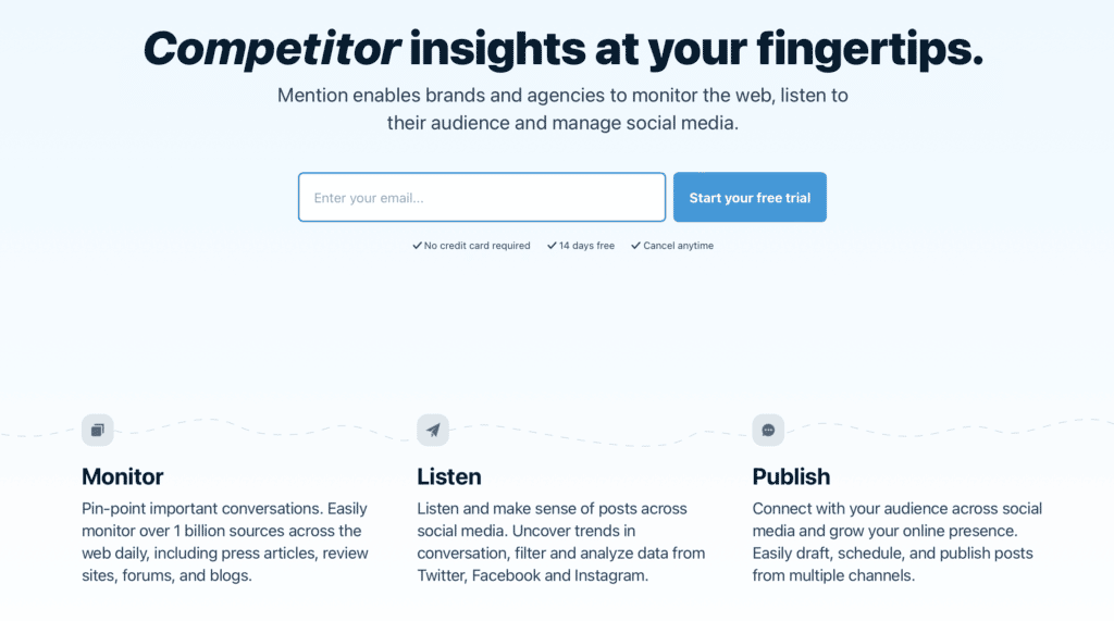 Mention est axé sur la surveillance des mentions de marque, produits, concurrents et mots clés sur le web et les réseaux sociaux. Il propose des alertes temps réel, des analyses de sentiment, des rapports et des exports. Convient aux PME et agences souhaitant suivre l’image et la part de voix.