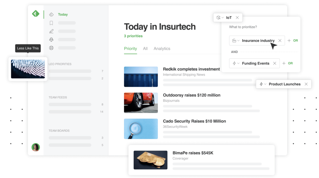 Idéal pour démarrer une veille éditoriale solide. Feedly agrège flux RSS, newsletters, recherches web et sources spécialisées. Son IA permet de filtrer par sujets, entités, risques, entreprises et signaux faibles. Les collections, étiquettes et notes facilitent la curation, tandis que les intégrations (Slack, Trello, Zapier) fluidifient la diffusion.