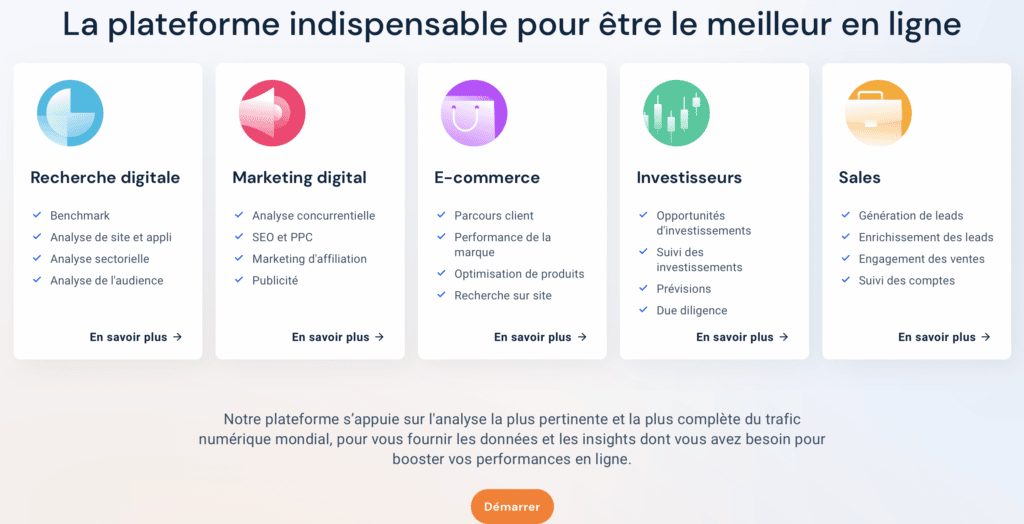 Similarweb estime l’audience, les sources de trafic, les mots clés, l’engagement et les parcours des visiteurs pour n’importe quel site. Pour la veille, il révèle des mouvements stratégiques (campagnes, expansions, saisonnalités) et permet des alertes sur variations d’audience.