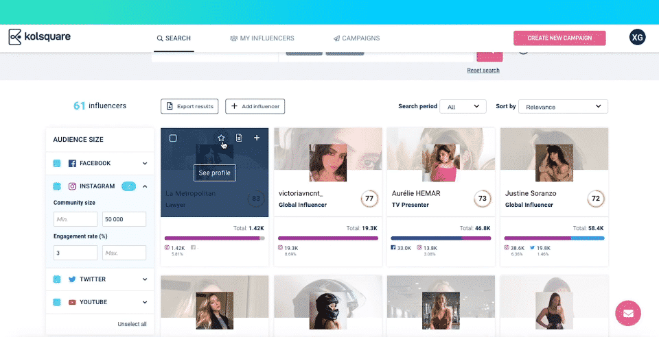A partir de là, vous pouvez filtrer les résultats. Si vous utilisez la version gratuite de Klear, vous pouvez uniquement filtrer par type d’influenceurs et par zone géographique. Avec la version Pro, vous pouvez aller plus loin et filtrer par canaux (Instagram, TikTok, YouTube, blogs), par compétences et même par sexe. Vous pouvez aussi, toujours dans la version Pro, exclure de vos recherches certains résultats (par exemple les influenceurs qui ont une faible popularité, les marques…)