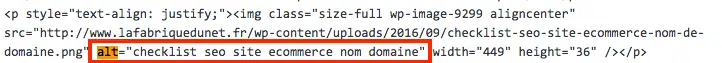 Les images constituent des éléments essentiels pour un site ecommerce, tout particulièrement dans les fiches produits. Le problème, c’est qu’un algorithme ne peut pas comprendre le contenu / l’intérêt de vos images. Il existe une astuce pour pallier à cet inconvénient, laquelle consiste à ajouter une description de l’image dans la balise « Alt ». Voici à quoi ressemble une balise ALT (exemple tiré de l’article que nous en sommes en train de rédiger !) :